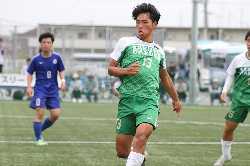 試合序盤、作陽学園はCB16番、4番を中心とし相手の攻撃を未然に防ぐ。後ろから両ワイドに精度の高いボールが何度も送られると、3番のサイドを突破する攻撃で玉野光南ゴールに迫る。
