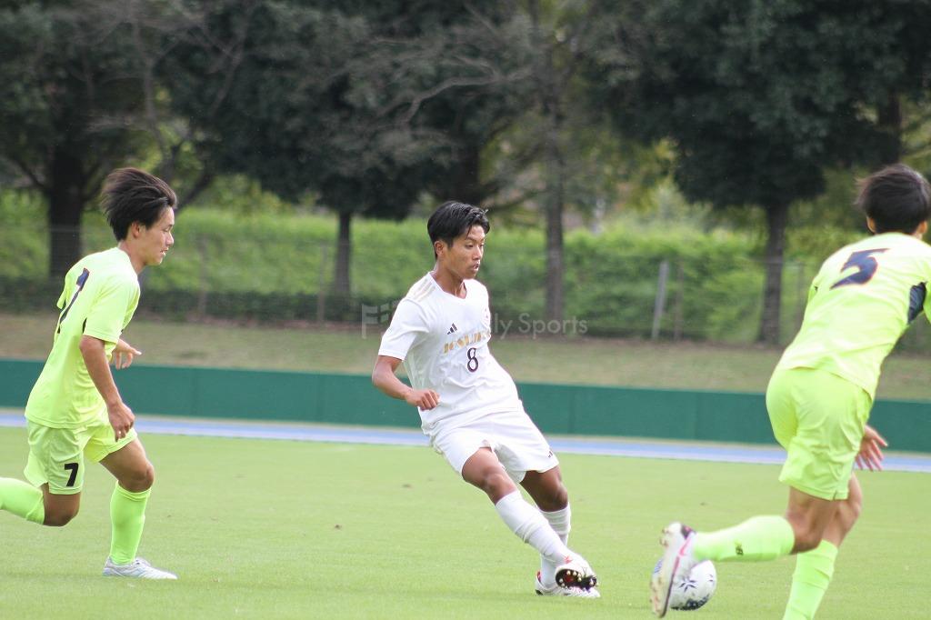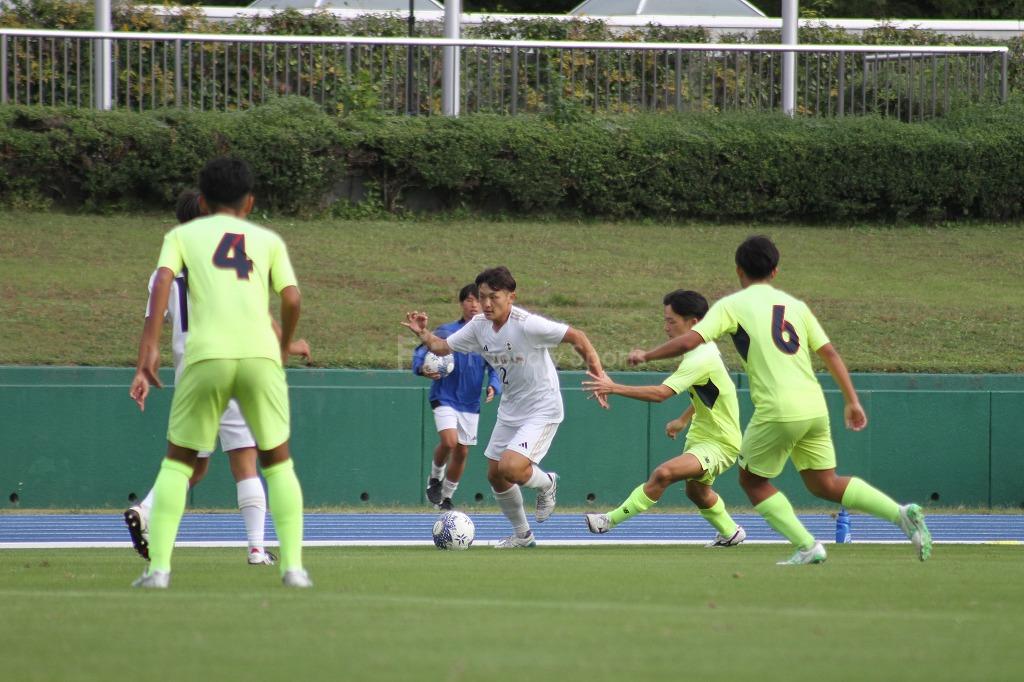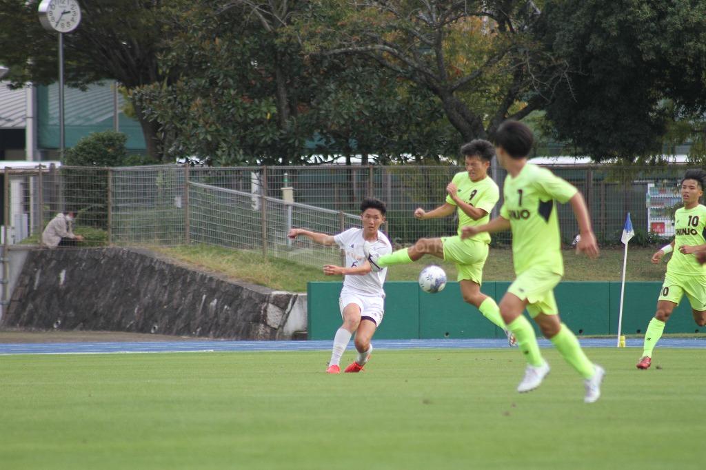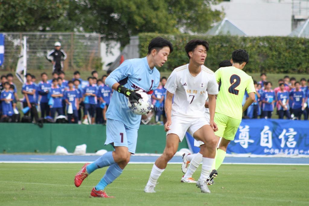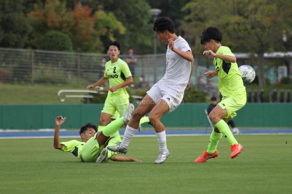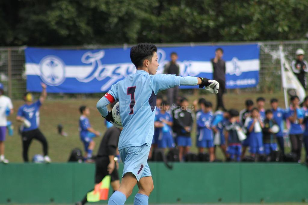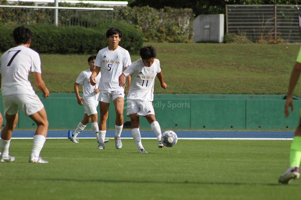 如水館は相手エリア左の狭いスペースで細かくつなぐと、ゴール前に低いクロス。これを決め1点を返す。前半終盤にCKから7番が頭でそらし3番が押し込み、前半のうちに同点に追いつく。
