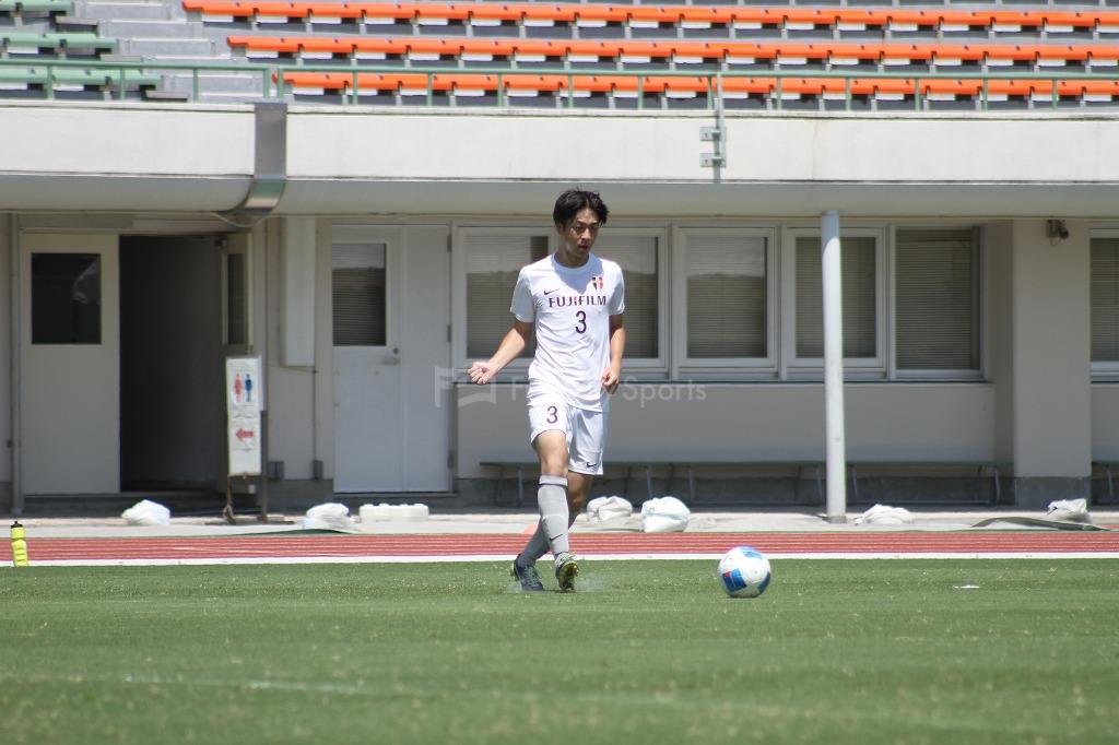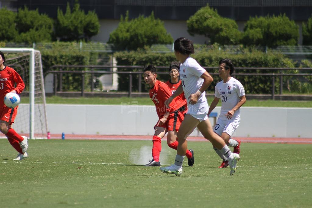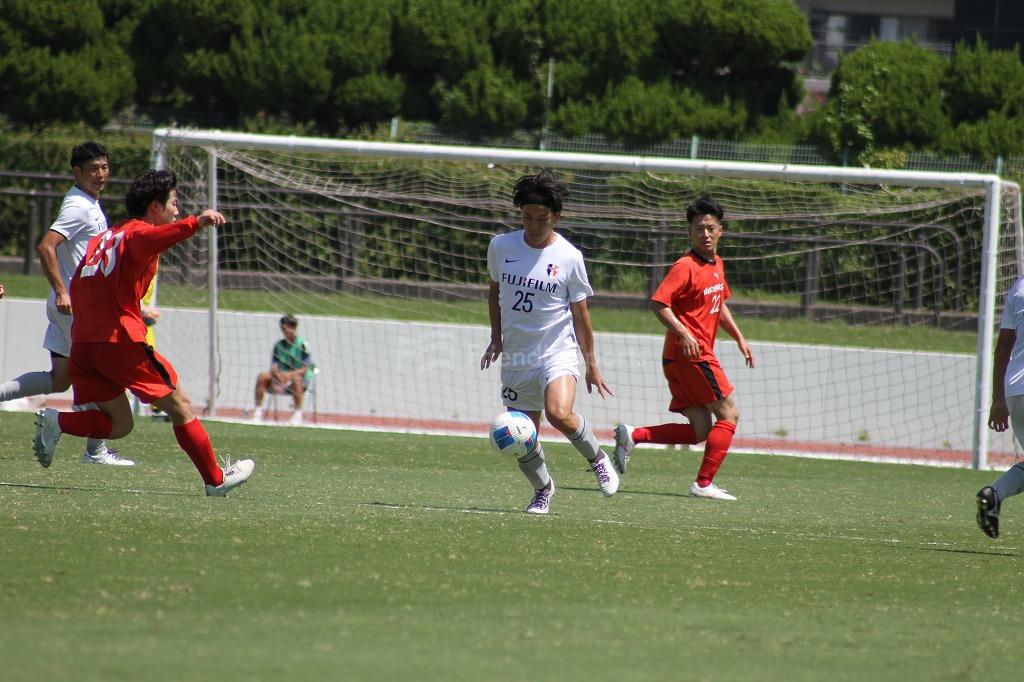 追いかける展開となった富士フィルム(以下:富士)は、前半終盤にCKのチャンス。ゴール前に上がったボールのこぼれ球を24番が右足でゴールに流し込み同点にする。