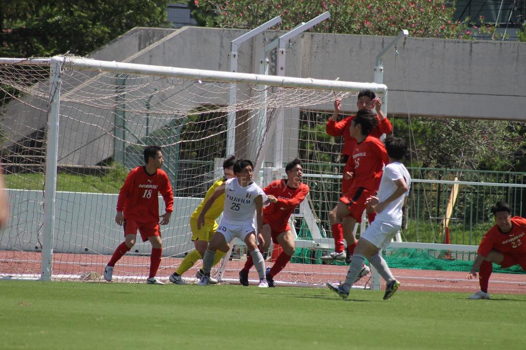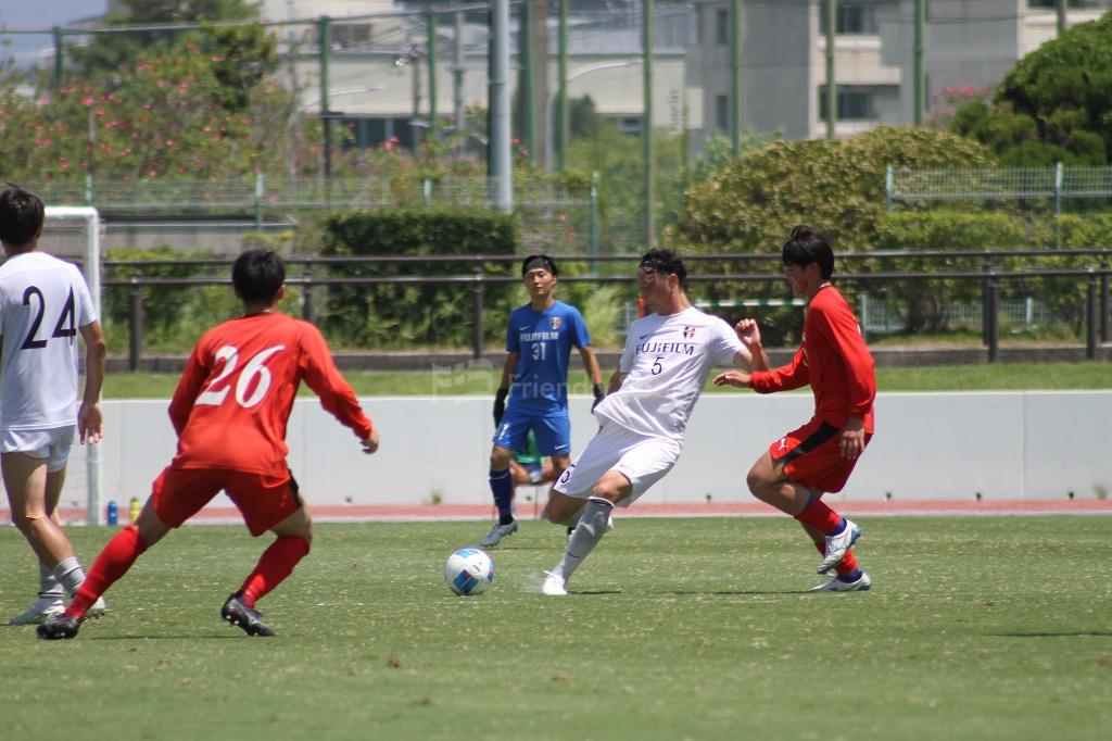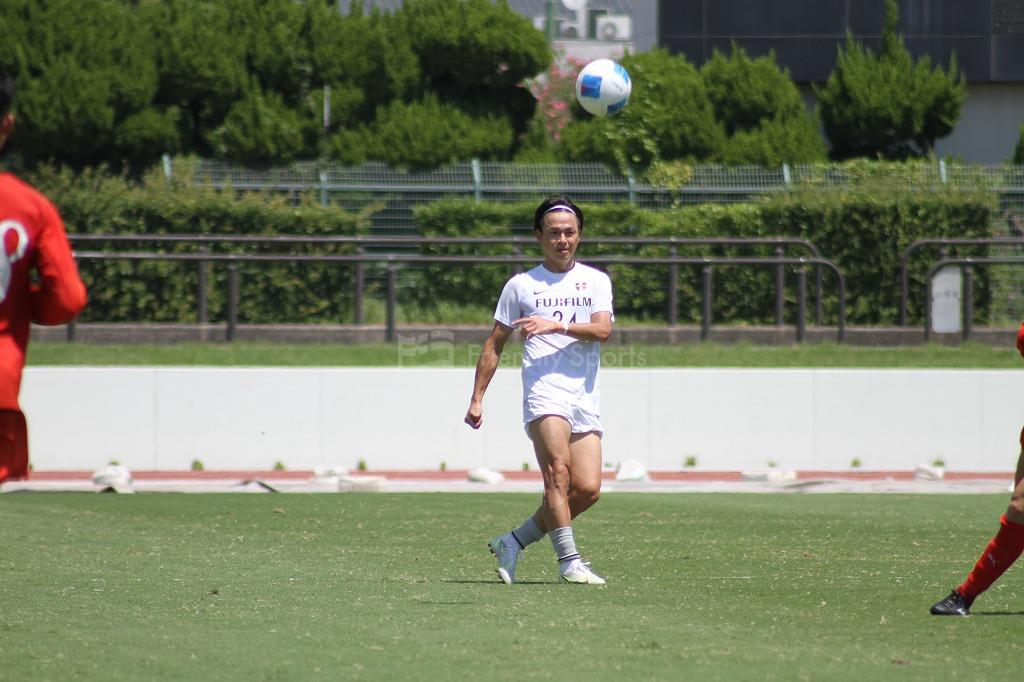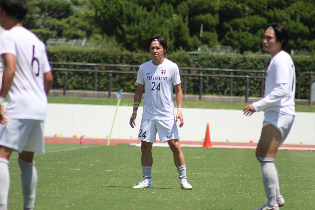 追いかける展開となった富士フィルム(以下:富士)は、前半終盤にCKのチャンス。ゴール前に上がったボールのこぼれ球を24番が右足でゴールに流し込み同点にする。