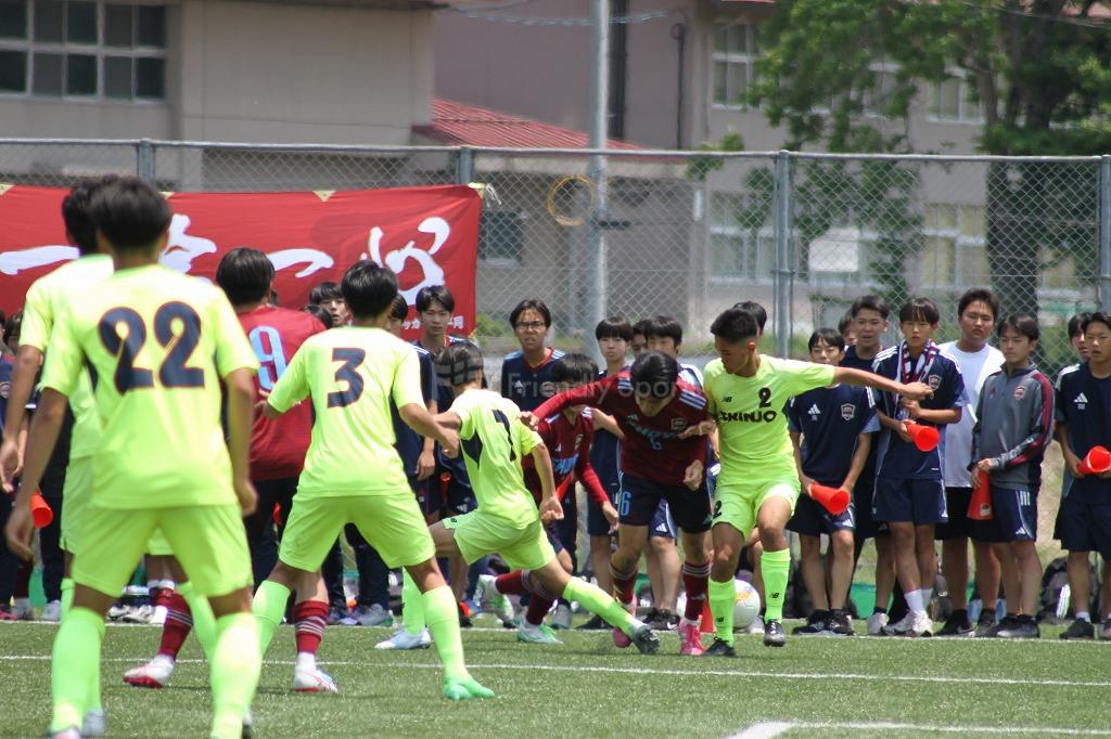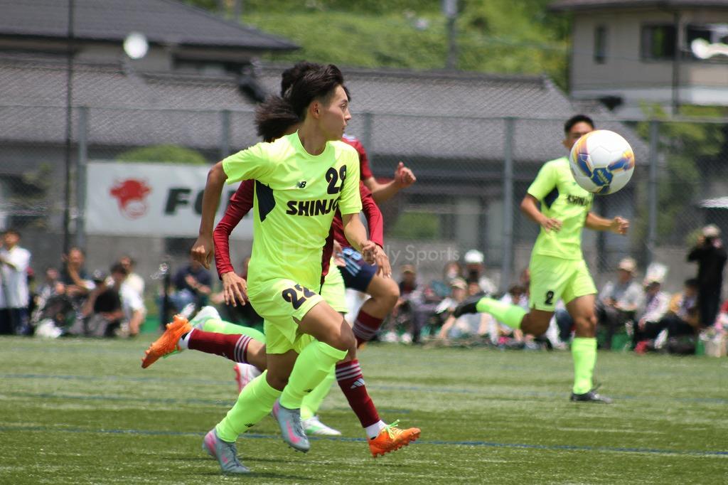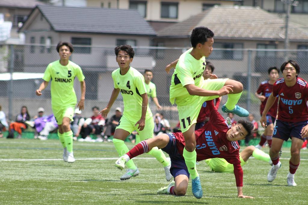 果敢にゴール前にボールを送りシュートを狙う新庄。決定的なシュートも翔洋DFはラインぎりぎりでクリアし追加点を与えない。