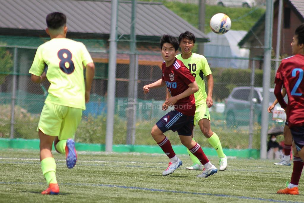 果敢にゴール前にボールを送りシュートを狙う新庄。決定的なシュートも翔洋DFはラインぎりぎりでクリアし追加点を与えない。