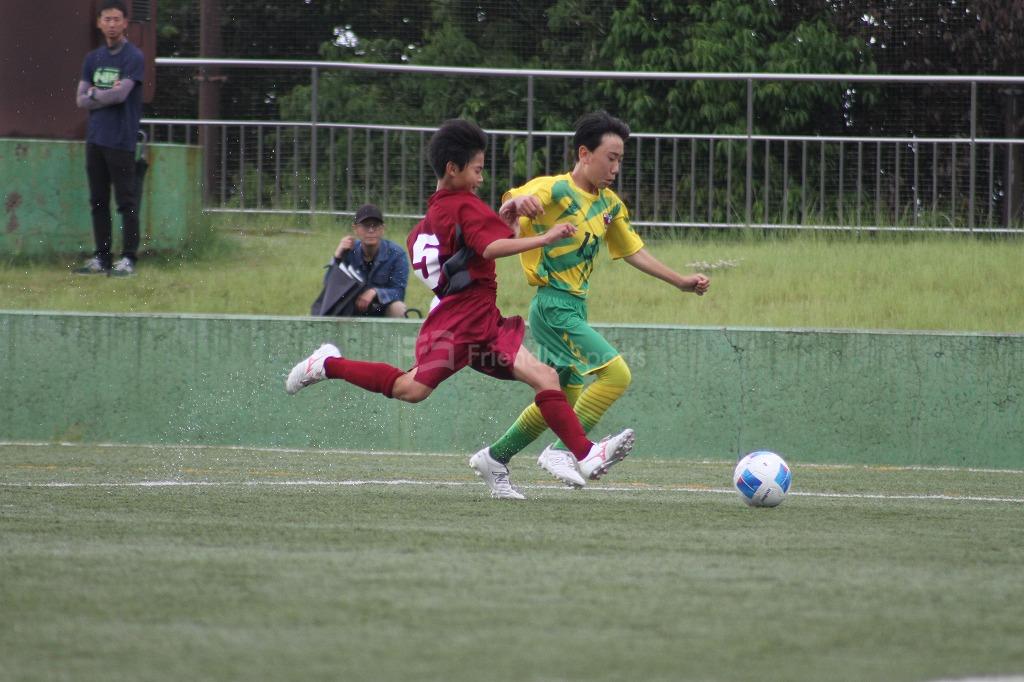 緑ヶ丘、左サイド14番がサイドを抜け出しシュートに持ち込むが、熊野東3番決死のカバーでシュートをブロック。