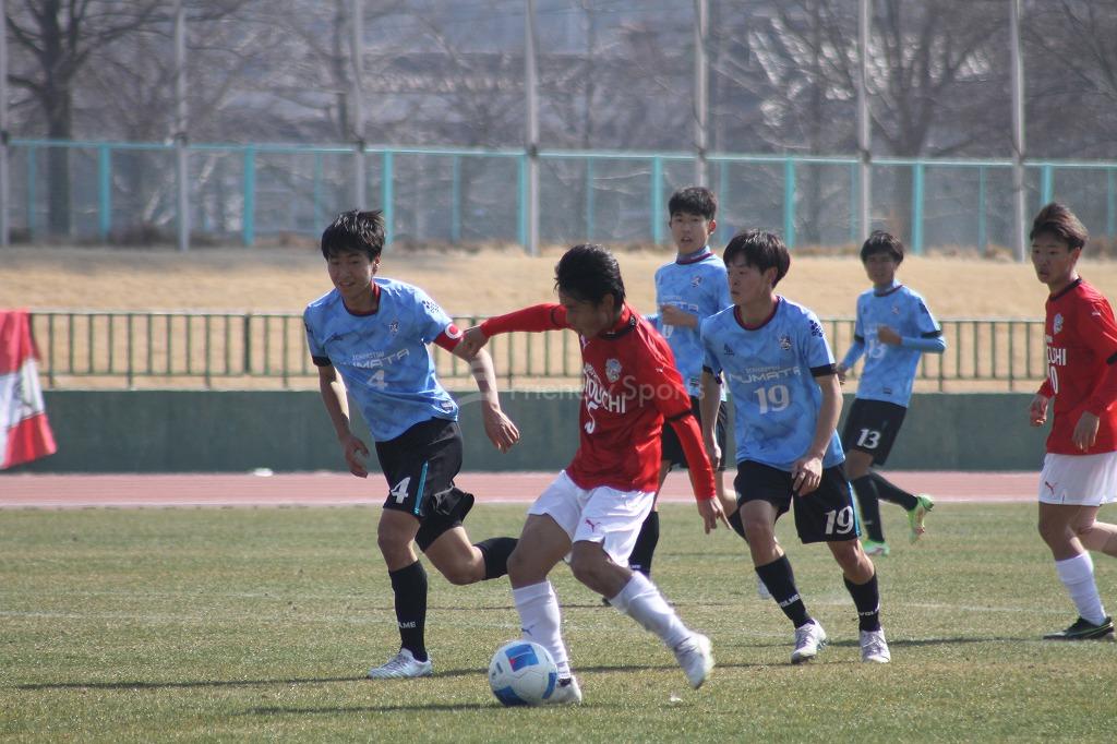 0-0のまま前半が終了かと思われたが、沼田はカウンターから左サイド13番にパスが通る。13番はエリア外から中央へカットインし右足を振りぬき先制ゴールを叩き込む。
