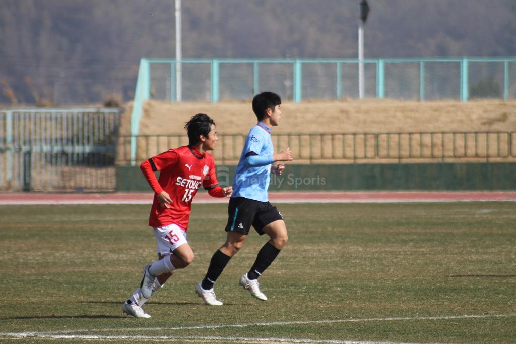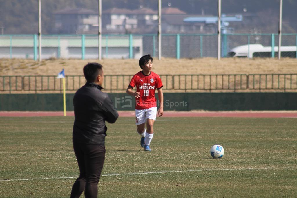 前半、瀬戸内は沼田の自陣からつなぐサッカーに対し、プレッシャーをかけミスを誘う。