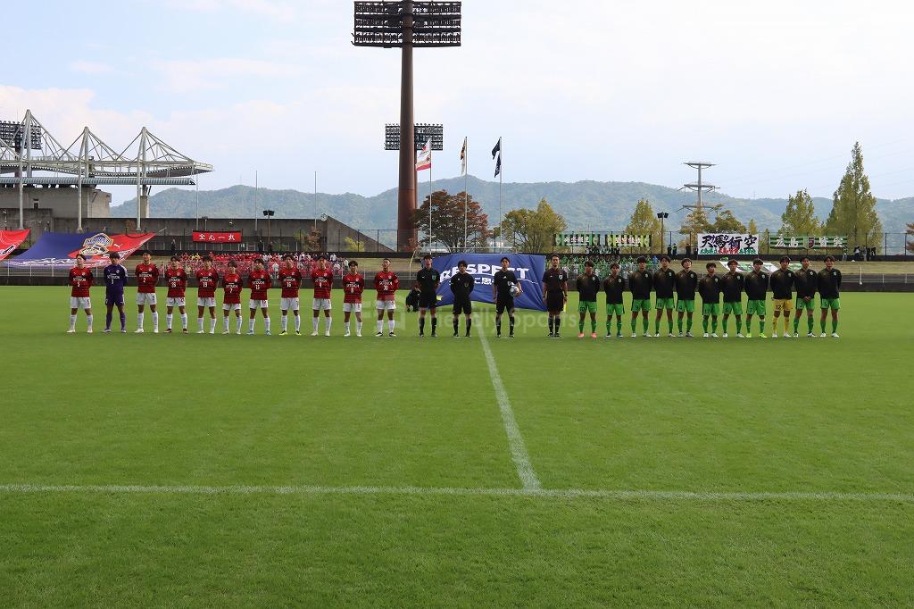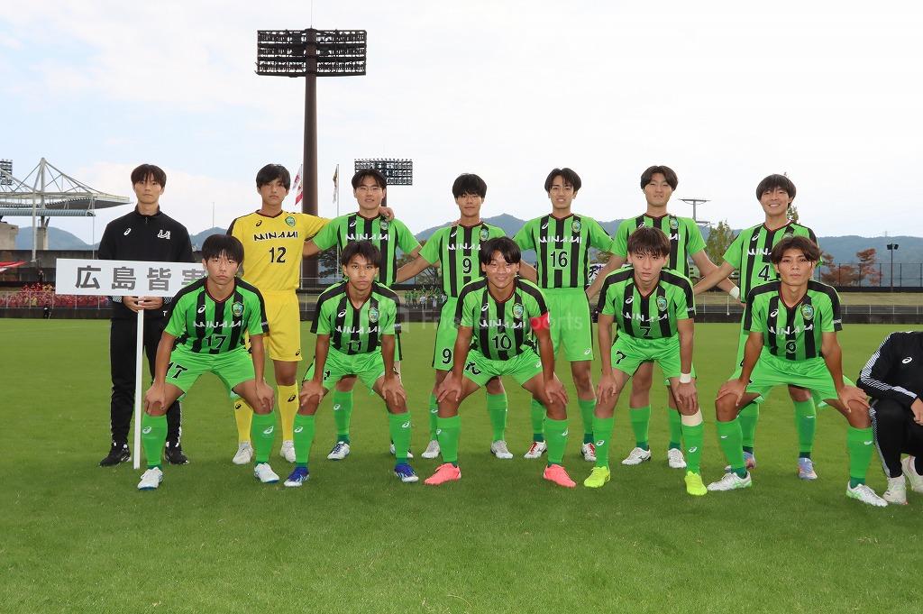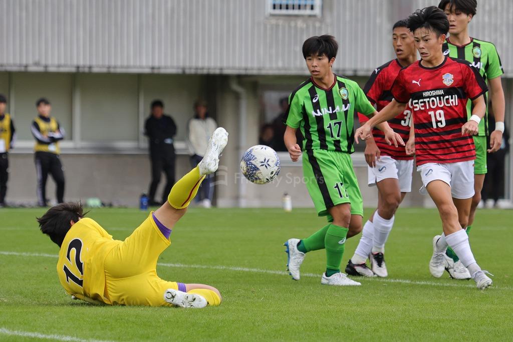 このままの時間帯が続き瀬戸内が逃げ切るかと思われたが、皆実はカウンターから右サイドを9番が裏へ抜け出すと、エリア右から右足でシュートを決め同点に追いつく。