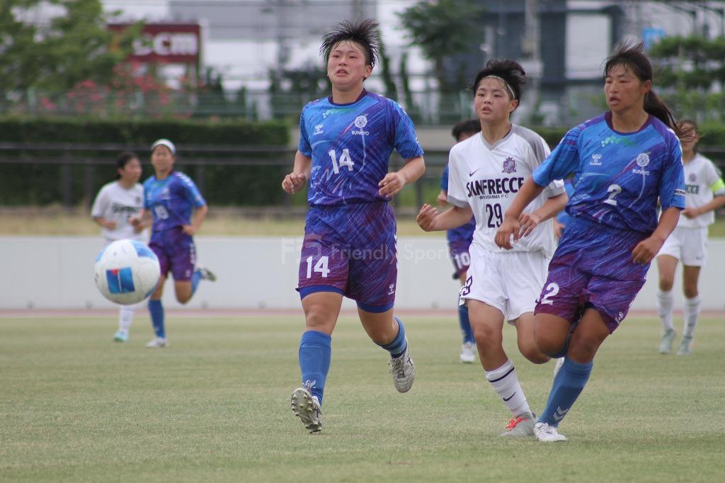 サンフレRユースと広島文教高校の対決は接戦となりました。ボールをうまく動かすサンフレに対し文教はカウンター攻撃で得点を狙います。後半にサンフレが1点を決め、これが決勝点となりサンフレが勝利します。