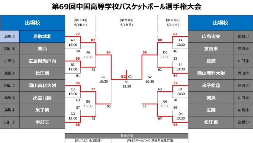 第69回中国高等学校バスケットボール選手権大会 6月14日(土) 【1回戦】 瀬戸内 vs 松江西 〇 95 ー 61 【2回戦】 瀬戸内 vs 鳥取城北 ● 65 ー 82 たくさんのご声援ありがとうございました。