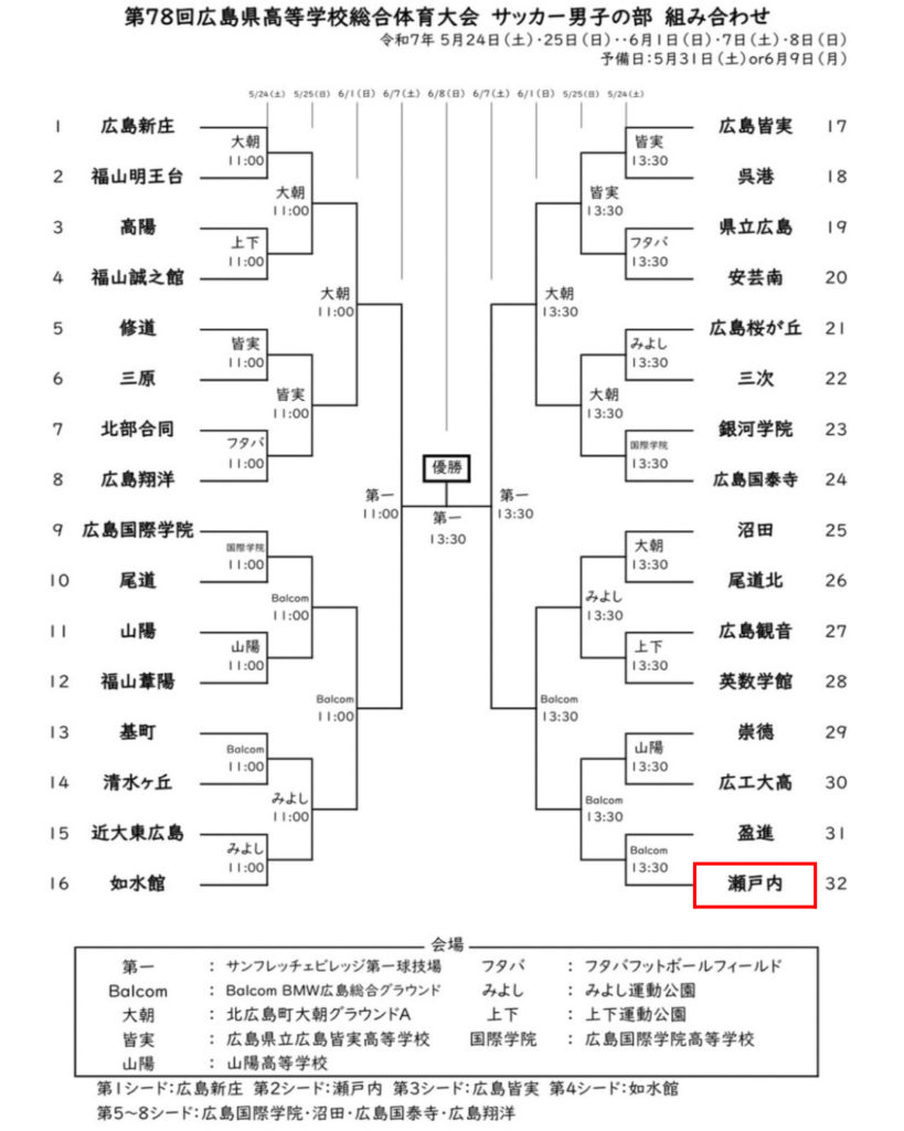 78回広島県高等学校総合体育大会 サッカー男子の部トーナメント表が発表されました。