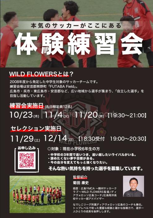 2025年9月27日 WILD FLOWERS 2026 年度体験練習会およびセレクション実施のお知らせ ◎対象: 中学校の 3 年間で追いつき、追い越したいライバルがいる。諦めたくない夢や目標がある。今の自分を変えてもっと強くなりたい。そんな熱い気持ちを持った選手(現在小学校 6 年生の方)を募集しています。 ◎会場:フタバフィールド(広島県安芸郡熊野町平谷 2 丁目 17-10) 資料1 資料2 Tags: フレスポNews, メンバー募集, 中学サッカー #フレスポNews#メンバー募集#中学サッカー 前の投稿 次の投稿 同じタグの記事すべて見る 桜が丘高校の生徒が岩崎運送株式会社へ社会見学 2025-12-02 サッカー 全⽇本⼤学サッカー選⼿権⼤会が予選ラウンドが広島で開催 2025-12-02 サッカー ベルガロッソ、プラシア昇格決定。残す1枠は廿日市ーViparteの勝者に。【プログレスチャレンジトーナメント】 高円宮杯U-15サッカーリーグ2025プログレスリーグ 2025-12-01 サッカー シーガルが優勝を決める【スポ少5年生大会】 令和7年度 広島市スポーツ少年団5年生サッカー大会 2025-11-30 サッカー 11月29日試合結果【高円宮杯U-18 2部】 高円宮杯 JFA U-18サッカーリーグ2025 広島 2025-11-29 サッカー 最終節が終了し、米子北、岡山学芸館がプレミアPOの切符を手にする【プリンスリーグ中国】 高円宮杯 JFA U-18サッカープリンスリーグ2025 中国 2025-11-29 サッカー 組み合わせが決まる【高校新人大会女子の部】 令和7年度広島県高等学校サッカー新人大会 女子の部 2025-11-27 サッカー 2026年度 青崎フットボールクラブU-15 セレクションのご案内 2025-11-26 サッカー #フレスポNewsの記事を見る